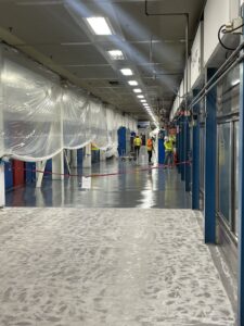 Aircraft hangars demand flooring systems that resist Jet-A, Avgas, Skydrol hydraulic fluid, and heavy ground